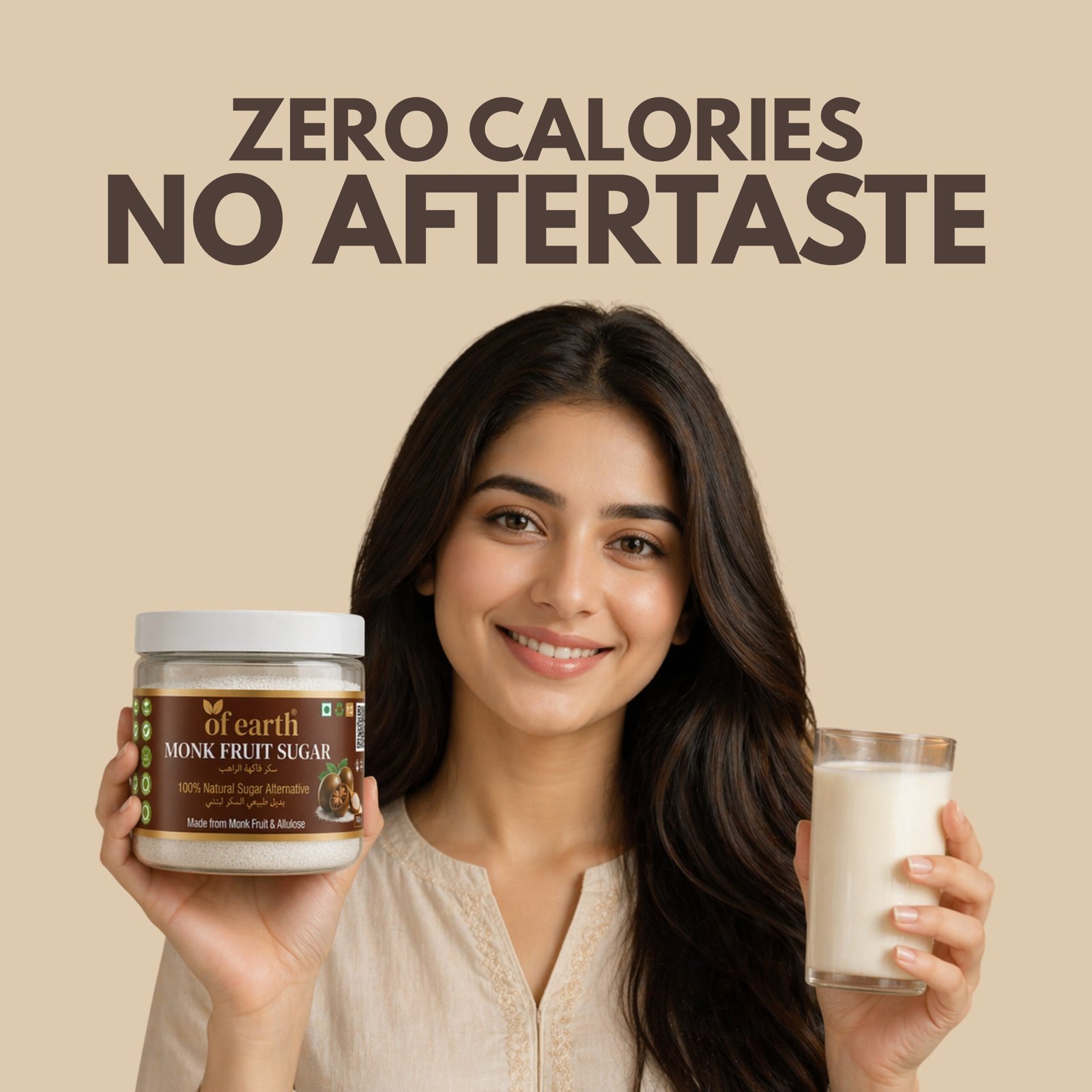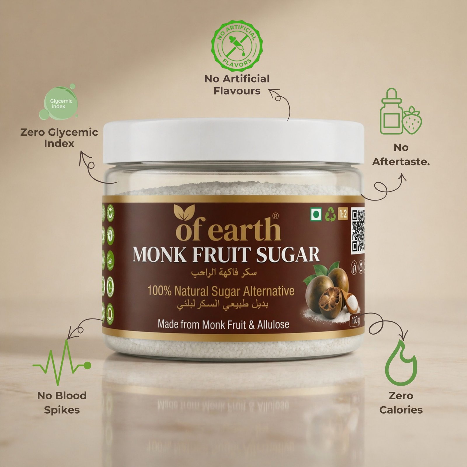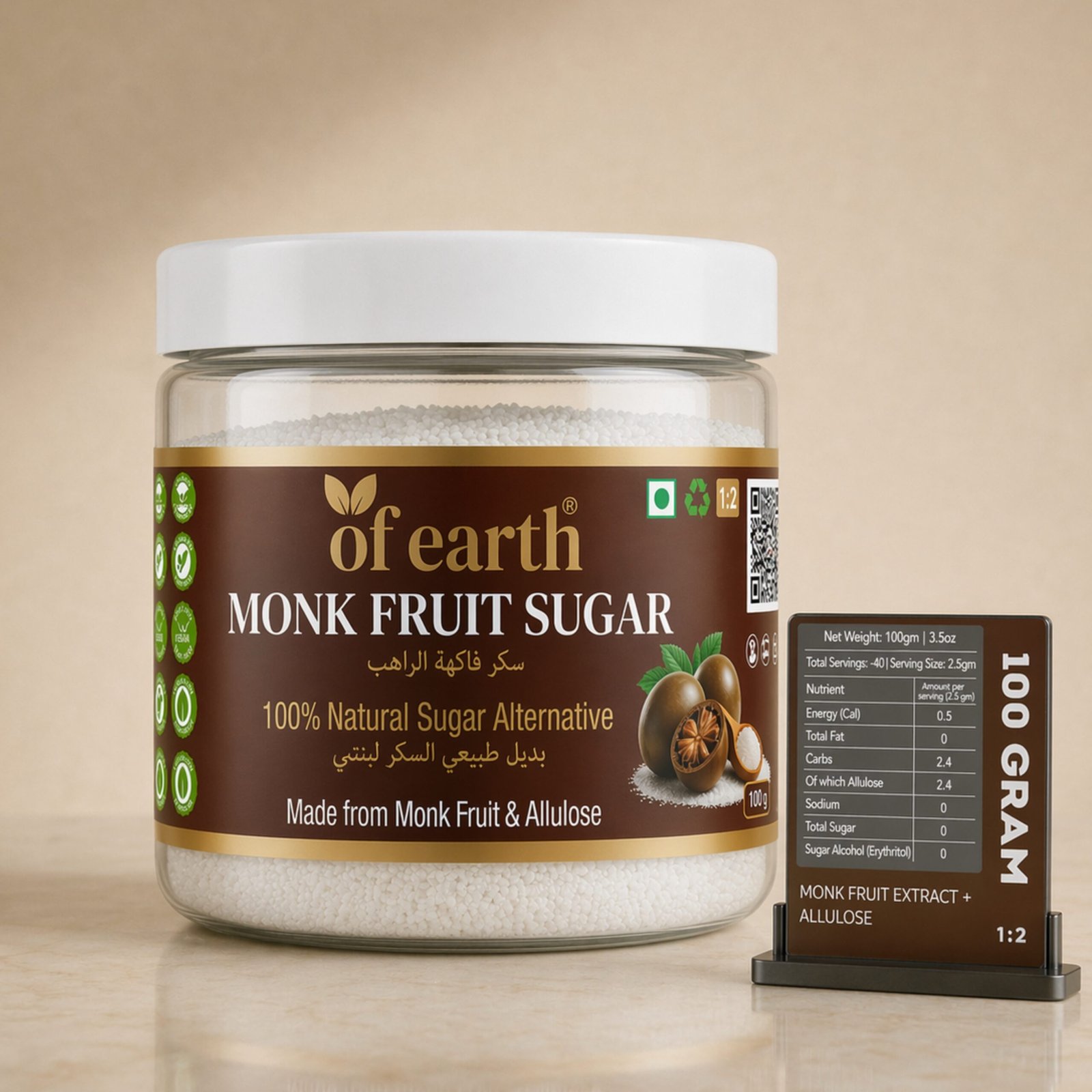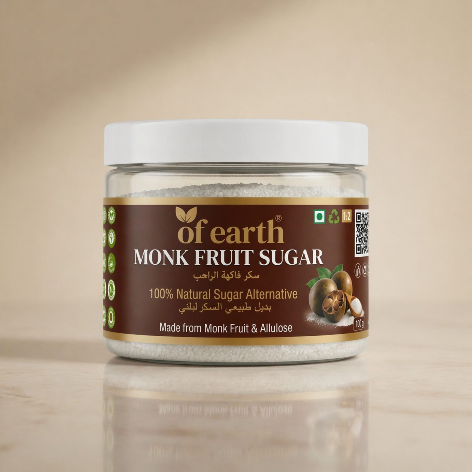 Of Earth Monk Fruit Sugar With Allulose| Zero-Glycemic Index, Low Calorie Sugar Substitute | EASY 1:2 SUGAR REPLACEMENT for Tea, Coffee, Beverages, Cooking & Baking | Plant-Based Natural Monk Fruit Sugar| Keto, Vegan & Diabetic Friendly | 100g |