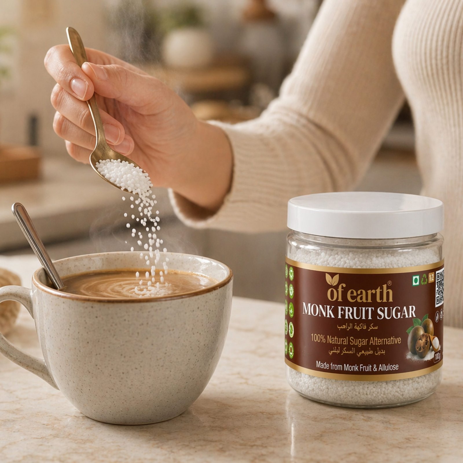 - Sweetness Level: Twice as sweet as sugar (1:2 usage) – 1 spoon Monk Fruit Sweetener with Allulose ≈ 2 spoons regular sugar